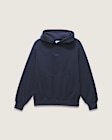 - Long sleeve hoodie with front kangaroo pocket, metal hook closure at hood opening, tonal logo embroidery at center chest and interior woven label