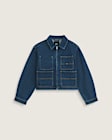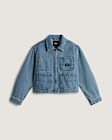 This women's denim jacket blends timeless workwear durability with modern street style. Crafted from heavyweight 12 oz cotton canvas, it features a cropped silhouette, zip front, and multi-pocket design for both function and fashion. The enzyme wash gives it a perfectly broken-in feel right out of the box, while contrast stitching and a woven Vans label add authentic details. It's built to last and ready for whatever your day brings.