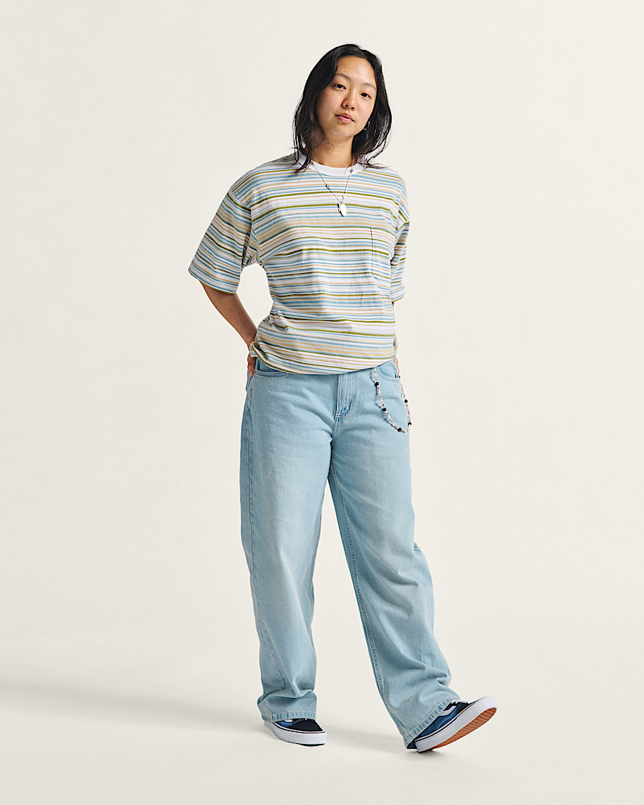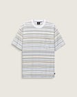The Braden Stripe Knit Shirt is a loose fit short sleeve T-shirt, yarndyed for more vibrant colors with an allover striped pattern. It's finished with a pocket at the chest.