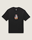 Tone it down in the Frizz T-Shirt, a loose fit short sleeve crew neck T-shirt with a screenprinted graphic of a spaced out cat sitting atop the Vans® logo.